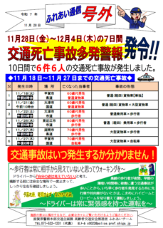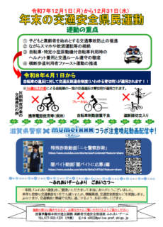 お知らせ重要なお知らせ滋賀県で高齢者の交通事故多発!ならびに年末年始の交通事故防止のためのふれあい通信 2025年12月1日 【無害化実施】R7 第12号「年末年始の交通事故防止」 R7 号外第05号「交通死亡事故多発警報発令」